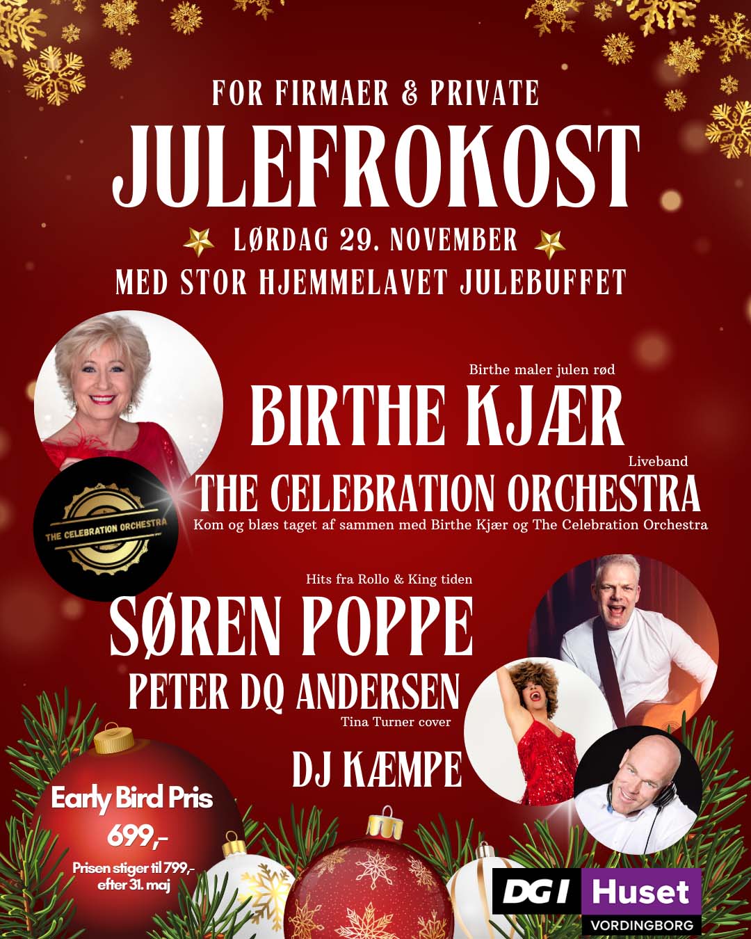 DGI Huset Vordingborg inviterer til en storslået julefrokost lørdag den 29. november 2025, hvor nogle af landets mest festlige navne skaber en aften fyldt med musik, dans, julemad og julestemning i topklasse. Med blandt andre Birthe Kjær, Søren Poppe, Peter DQ Andersen, DJ Kæmpe og det sprudlende liveband The Celebration Orchestra er der lagt op til et brag af en julefest for både firmaer og private.