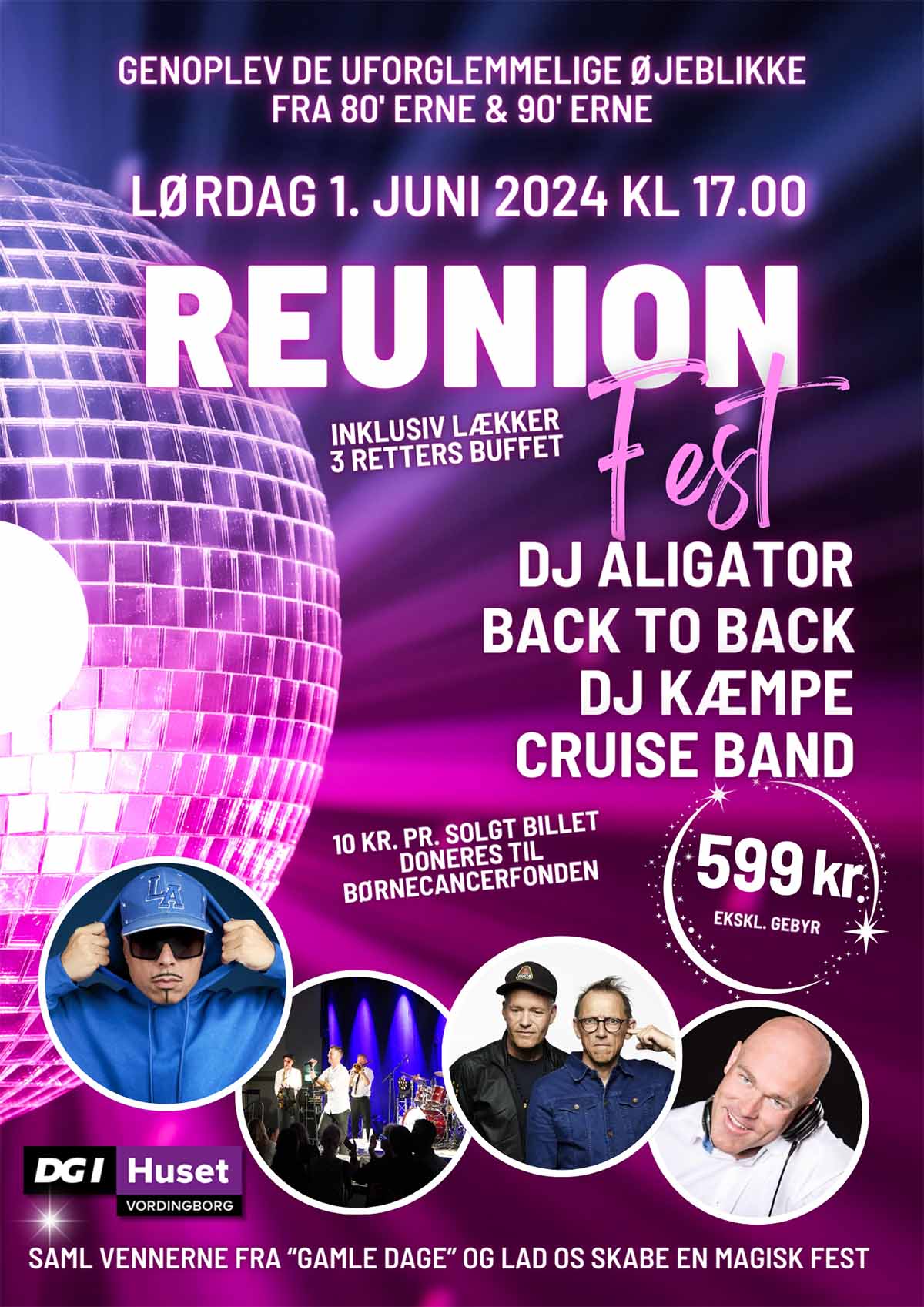 REUNION Festen i DGI Huset Vordingborg den 1. juni 2024 nærmer sig med hastige skridt, og arrangørerne er stolte af at præsentere et stjernespækket lineup af store kunstnere fra 80’erne og 90’erne. Blandt de prominente navne, der vil optræde til festen, er DJ Aligator, Back To Back, Cruise Band og den lokale DJ Kæmpe.